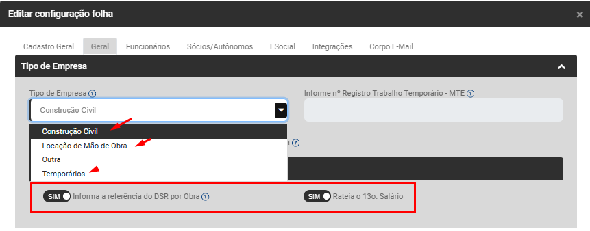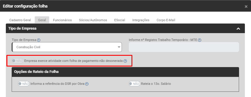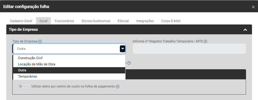 Se for definido Tipo de Empresa Construção Civil, Locação de Mão de Obra ou Temporários o Módulo habilitará o campo de Opções de Rateio da Folha