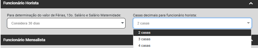 Informe a quantidade de casas decimais para funcionário horista - 2, 3 ou 4 casas