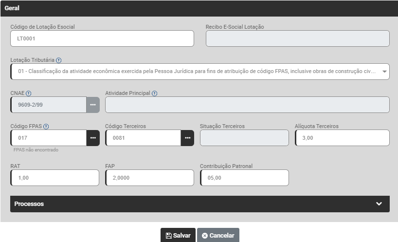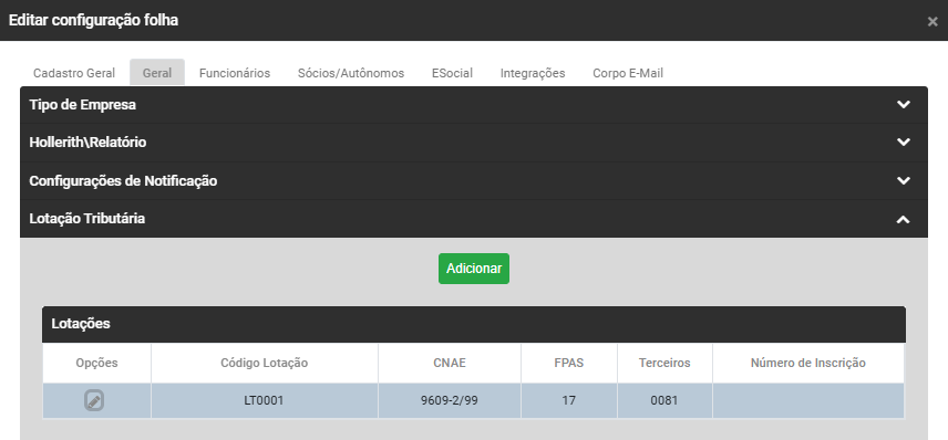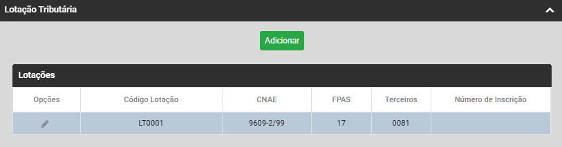 Clique no Botão Adicionar para informar a Lotação Tributária da Empresa