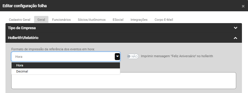 Defina também se no mês de aniversário do funcionário a mensagem "Feliz Aniversário" deverá ser impressa no Hollerith e se houver uma mensagem que deva ser impressa em todos os holleriths faça o Cadastro da mesma