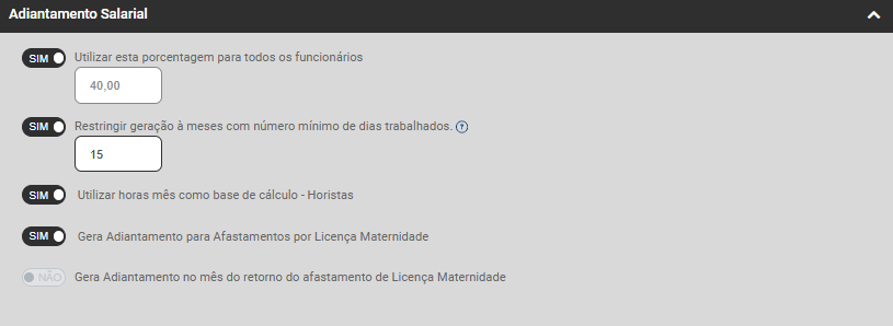 - Configure também se no mês de retorno do afastamento de Licença Maternidade será gerado o Adiantamento Salarial do funcionário