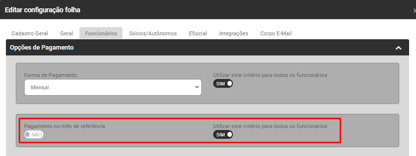 - Defina também se o Pagamento é realizado no mês de referência, caso essa opção não seja selecionada o Sistema irá considerar como Pagamento no Quinto Dia Útil do mês subsequente, em seguida defina se essa configuração deverá ser utilizada para todos os funcionários