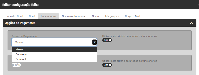 - No campo Forma de Pagamento defina se o Pagamento dos Funcionários é Mensal, Quinzenal ou Semanal e em seguida defina se essa configuração deverá ser utilizada para todos os funcionários