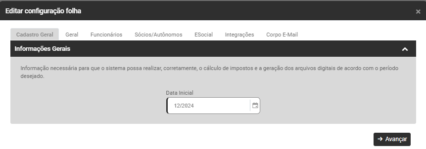 Informe na aba Informações Gerais a Data Inicial de utilização do Módulo Folha de Pagamento