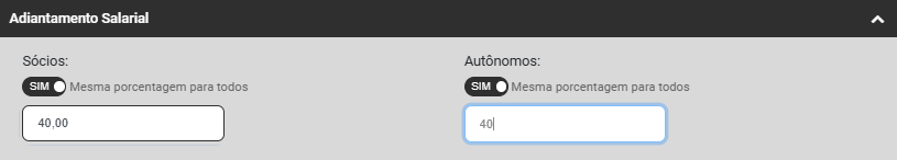 - Se o Percentual de Adiantamento Salarial for igual para todos os Sócios e Autônomos, selecione a opção Utilizar esta porcentagem para todos os Sócios e Autônomos e em seguida informe o percentual do Adiantamento Salarial, caso o percentual não seja igual para todos os Sócios e Autônomos, você deverá colocar a informação no Contrato de Trabalho de cada sócio ou autônomo