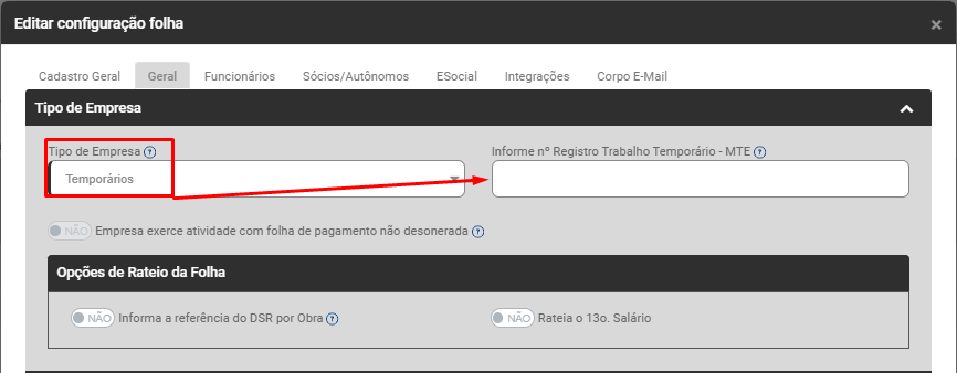 Se for definido Tipo de Empresa Temporário o Módulo habilitará o campo Informe o número Registro Trabalho Temporário - MTE