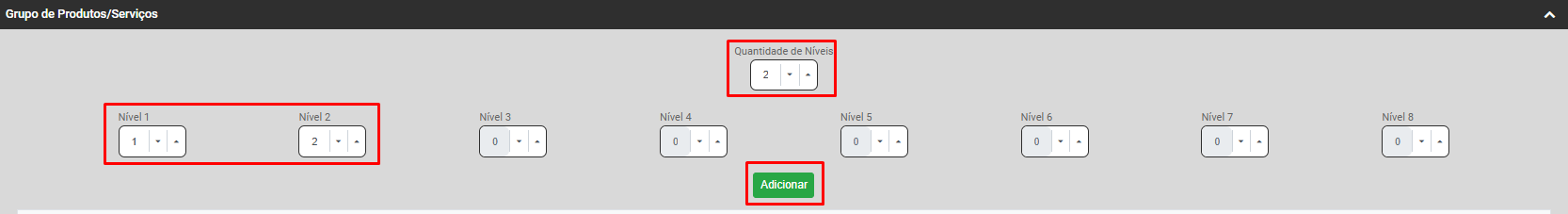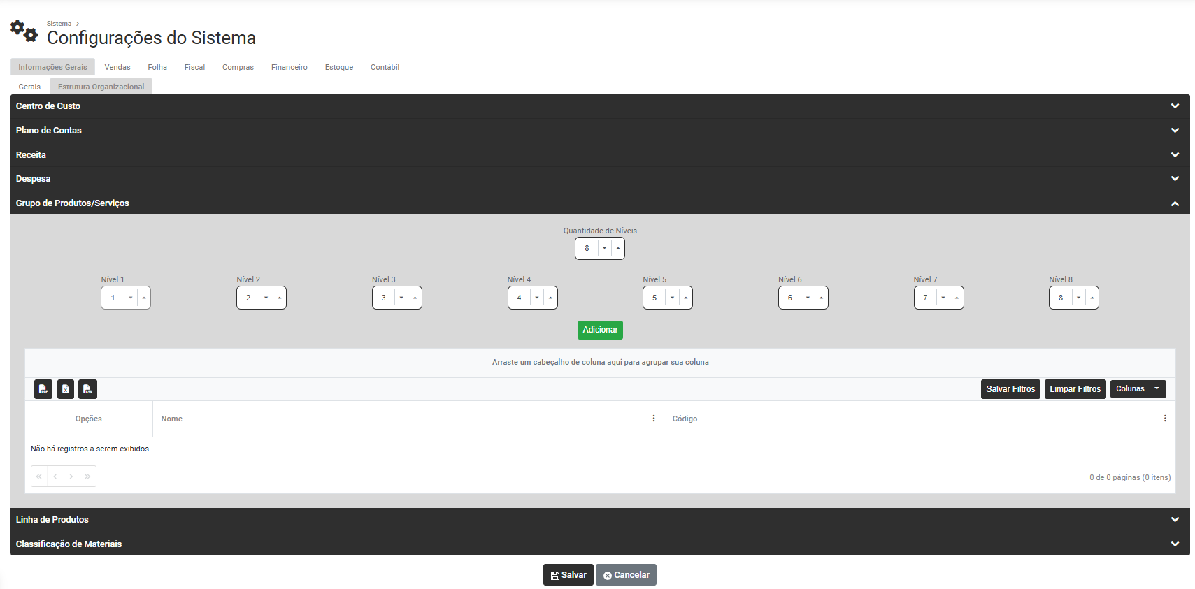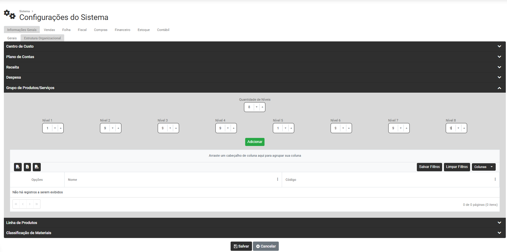 a) Informe quantos Níveis terá a Estrutura dos Grupos de Produtos - Você conseguirá definir até 8 níveis para composição dos Grupos Despesa