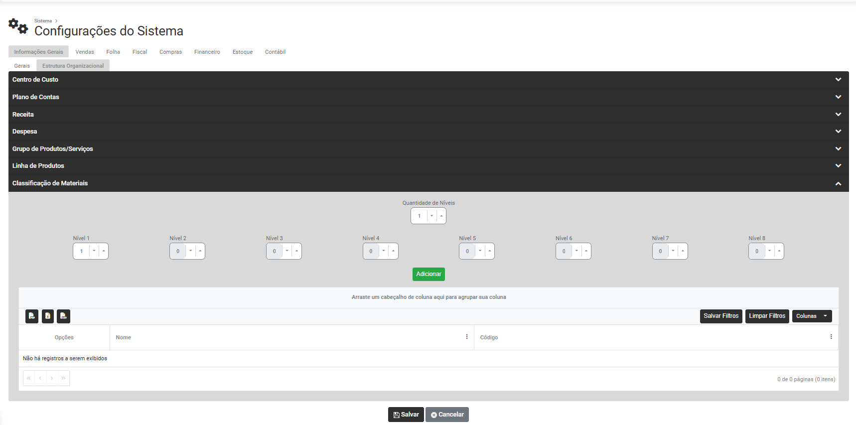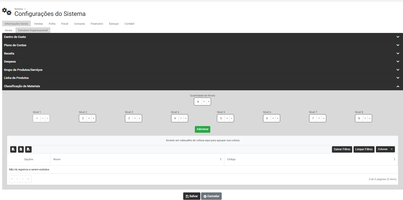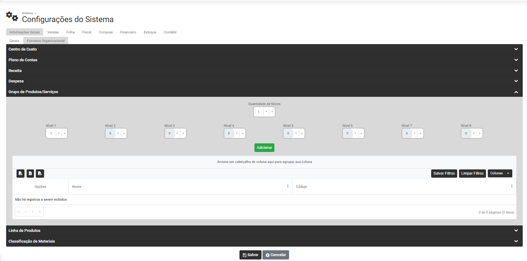 a) Informe quantos Níveis terá a Estrutura dos Grupos de Produtos - Você conseguirá definir até 8 níveis para composição dos Grupos Despesa