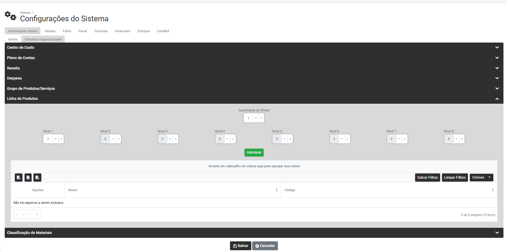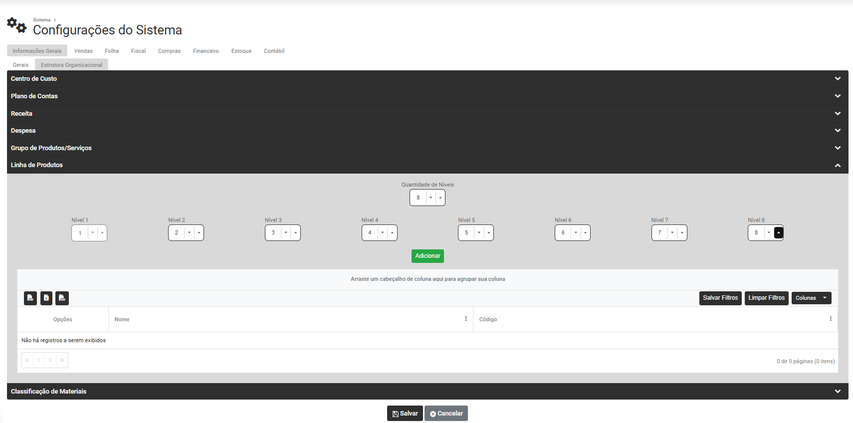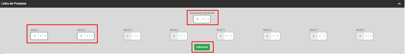 a) Informe quantos Níveis terá a Estrutura das Linhas de Produtos - Você conseguirá definir até 8 níveis para composição das Linhas de Produtos