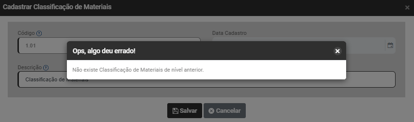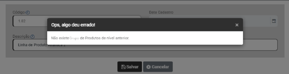 Caso você faça o Cadastro de um nível do Grupo de Produto sem ter feito o cadastro do nível anterior o Módulo apresentará mensagem pedindo o cadastro do nível anterior