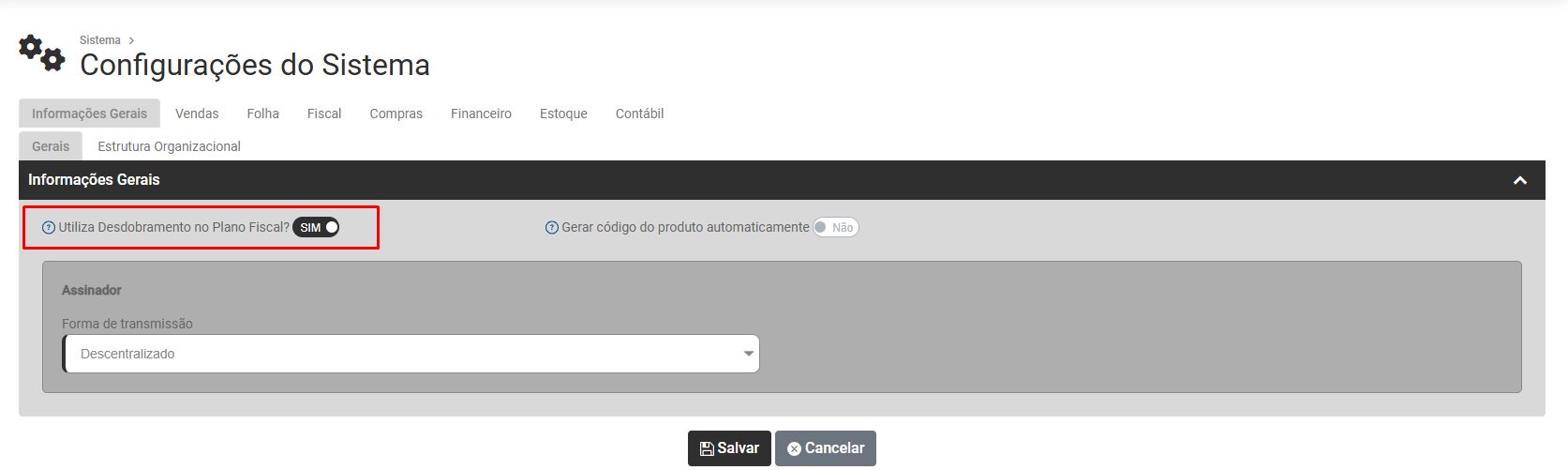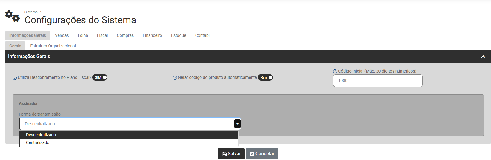 As Configurações doestão Sistema está divididadivididas em duas abas (Informações Gerais/Estrutura Organizacional e o Módulo Folha) e na aba Informações Gerais/Estrutura Organizacional você irá definir Configurações que serão utilizadas em todos os Módulos do Sistema