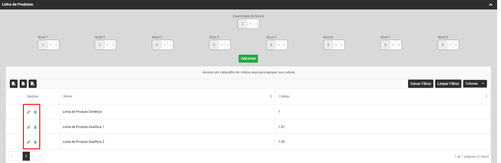 Depois dos cadastros realizados, o Grid apresentará todas as Linhas de Produtos cadastradas e através do Grid você conseguirá editar ou excluir a Linha de Produto (a exclusão só será possível se a mesma ainda não foi vinculada a nenhum produto da Empresa)