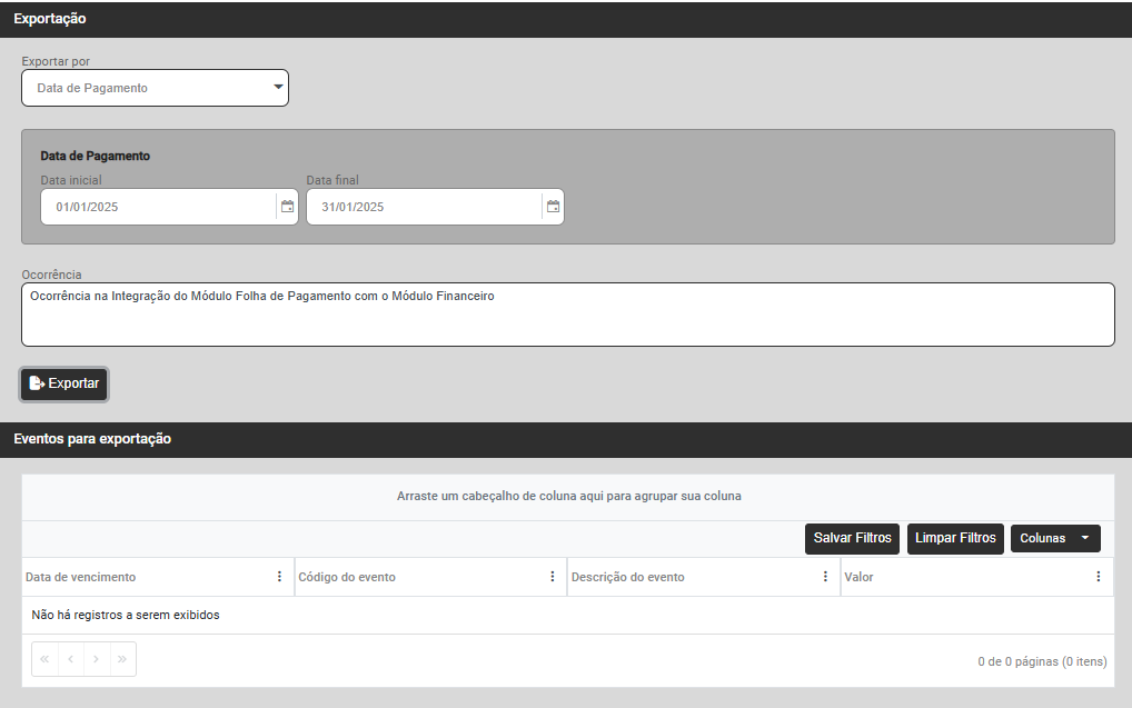 - Exporta dados Financeiros por Centro de Custo considerando o Cadastro de Obra/Contratante - O Sistema irá gerar os Contas a Pagar no Módulo Financeiro somando os valores de acordo com a geração feita por Obra/Contratante