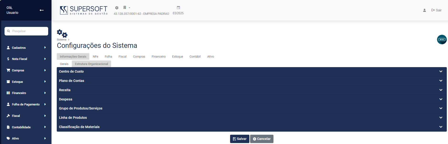 - CENTRO DE CUSTO (utilização nos Módulos Ativo, Compras, Contabilidade, Estoque, Financeiro, Folha e Vendas)