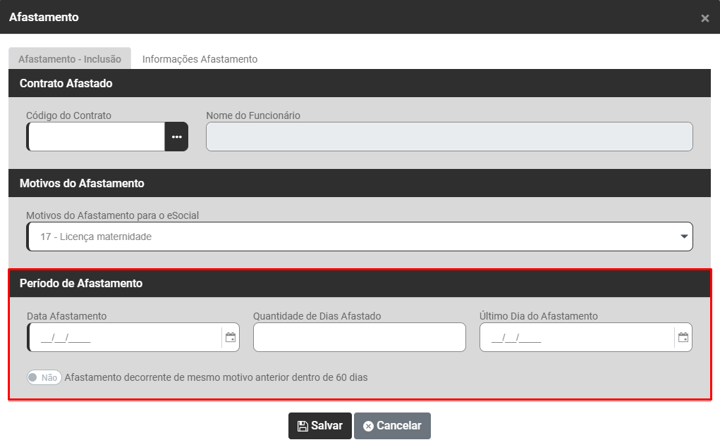 Cadastro de Afastamento por Motivo de Licença de Maternidade