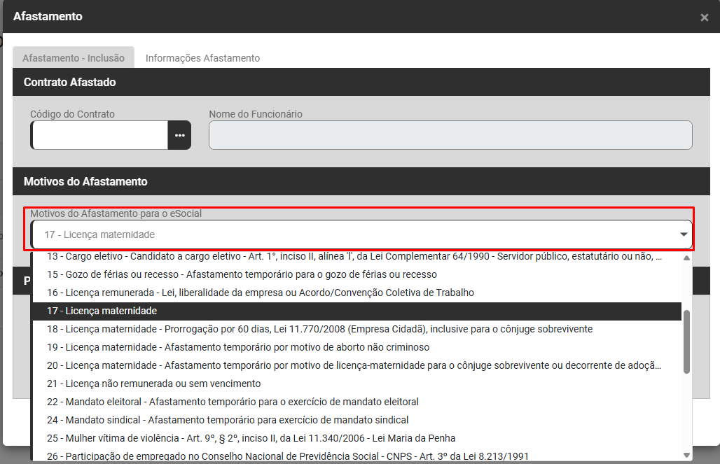 - Motivo do Afastamento para o eSocial, para Licença Maternidade deverá ser informado o Código 17