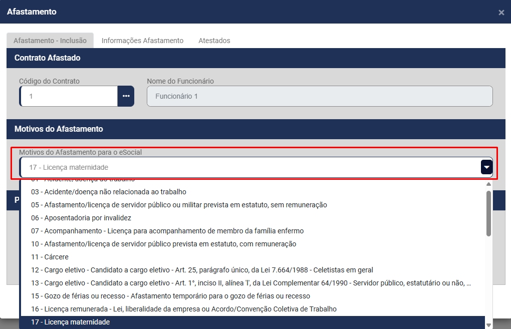 - Motivo do Afastamento para o eSocial, para Licença Maternidade deverá ser informado o Código 17