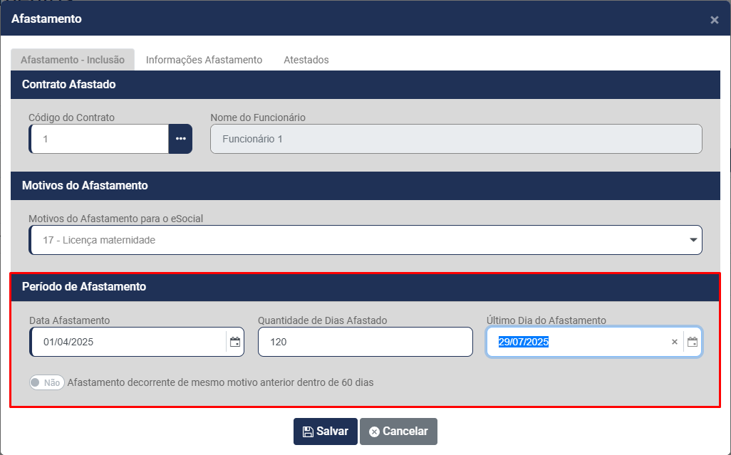 - Afastamento decorrente de mesmo motivo anterior dentro de 60 dias - Sim/Não