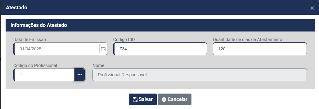 - Nome do Profissional Responsável - será preenchido automaticamente quando for informado o Código do Profissional Responsável