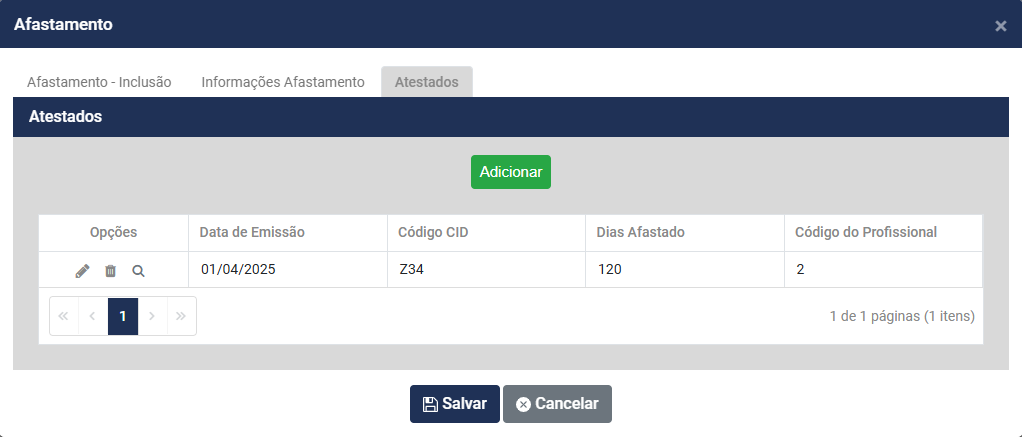 Depois da informações preenchidas clique para salvar e no Grid do Cadastro de Afastamento/Atestado você conseguirá visualizar as informações: