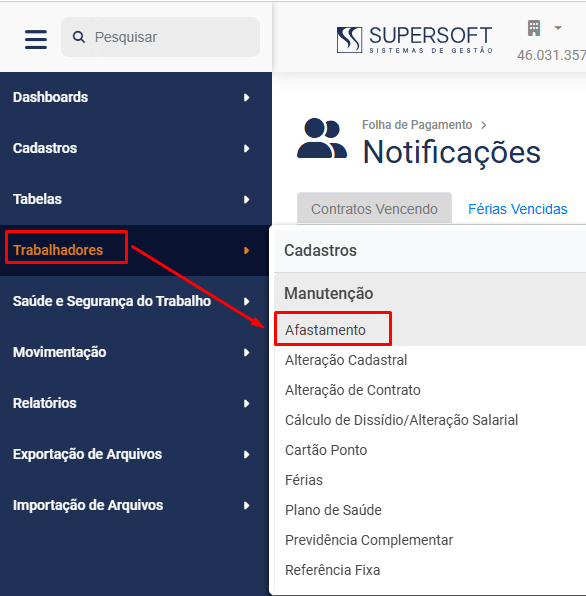 Para cadastrar os Afastamentos de sua Empresa acesse o menu Folha de Pagamento>Trabalhadores>Manutenção>Afastamento
