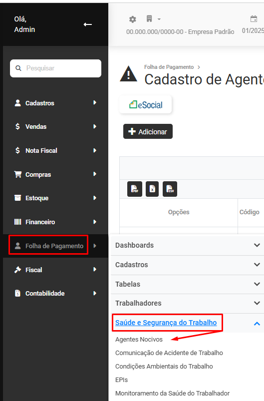 Para cadastrar os Agentes Nocivos aos quais os Trabalhadores de sua Empresa estão expostos, você deverá acessar o menu Folha de Pagamento>Saúde e Segurança do Trabalho>Agentes Nocivos