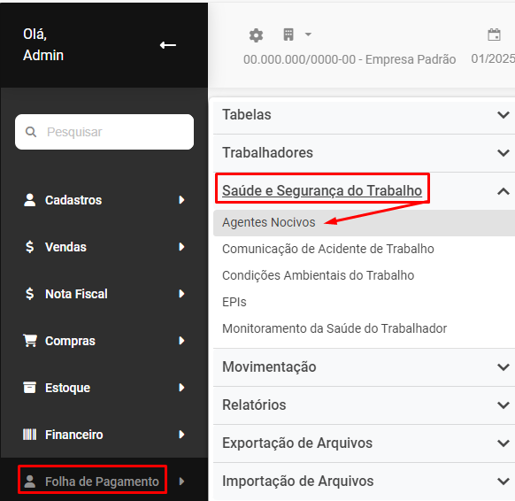 Para cadastrar os Agentes Nocivos aos quais os Trabalhadores de sua Empresa estão expostos, você deverá acessar o menu Folha de Pagamento>Saúde e Segurança do Trabalho>Agentes Nocivos