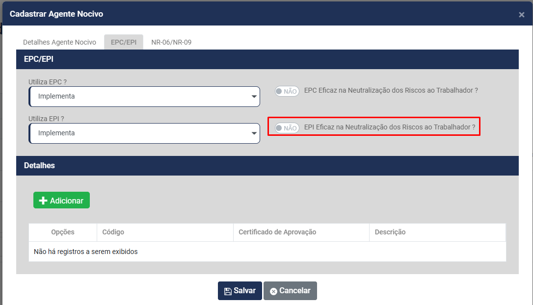Ao definir que que IMPLEMENTA EPI (Equipamento de Proteção Individual) será habilitado o campo Detalhes para que você clique no botão Adicionar e informe os EPIs utilizados para neutralizar o Agente Nocivo cadastrado anteriormente