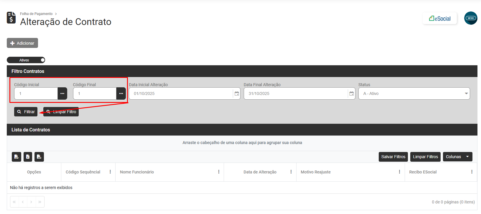 Será apresentada a tela para que você defina (filtre) qual é o Contrato que deseja visualizar, defina o contrato e clique em Filtrar