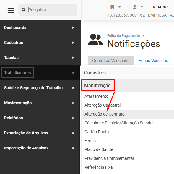 Para que você Visualize as Alterações Contratuais deverá acessar o menu Trabalhadores>Manutenção>Alteração de Contrato