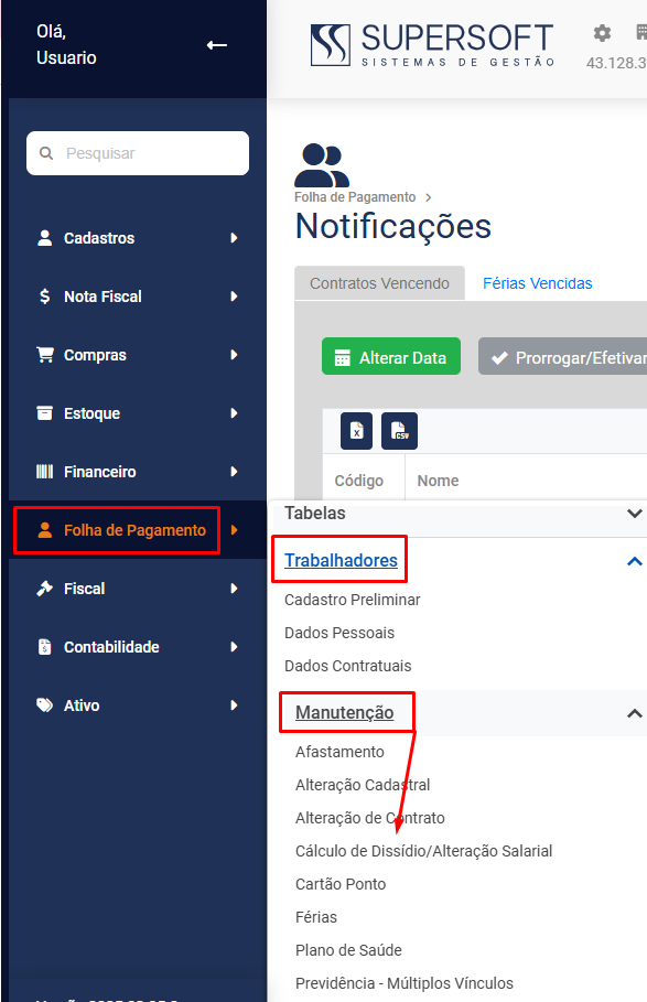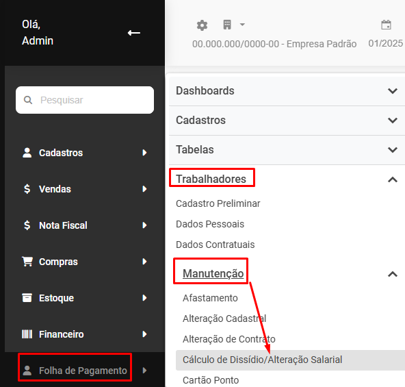 Para que você realize o Cálculo de Dissídio ou Alteração Salarial, deverá acessar o menu Folha de Pagamento>Trabalhadores>Manutenção>Cálculo de Dissídio/Alteração Salarial