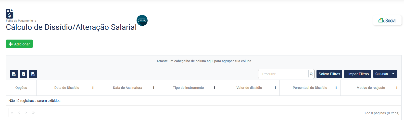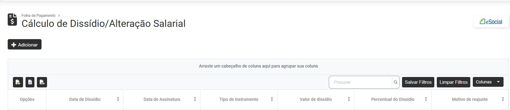 Para cadastrar um novo Dissídio Coletivo, certifique-se de que você está com o Módulo definido na data correta e em seguida clique no botão Adicionar existente na parte superior da tela
