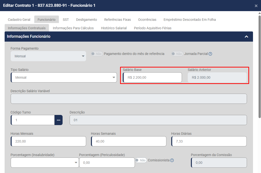 - Valor do novo salário - Ao preencher esse campo, salário será substituído pelo valor que foi informado.
