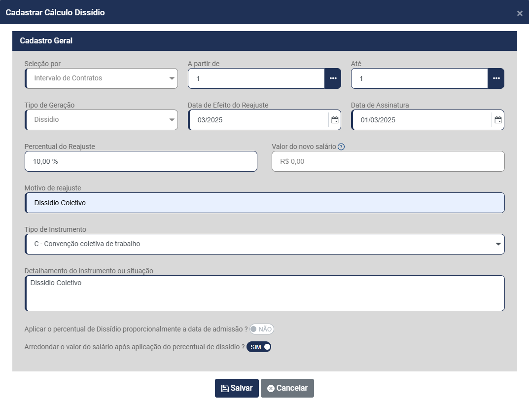 Cadastro de Cálculo de Dissídio/Alteração Salarial