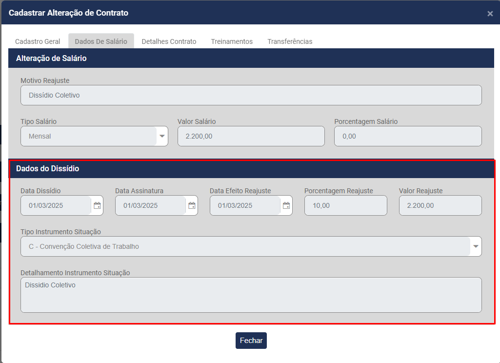 b) Será possível também, verificar que em Alteração de Contrato, o campo Dados do Dissídio foi preenchido com as informações da Geração do Dissídio Coletivo