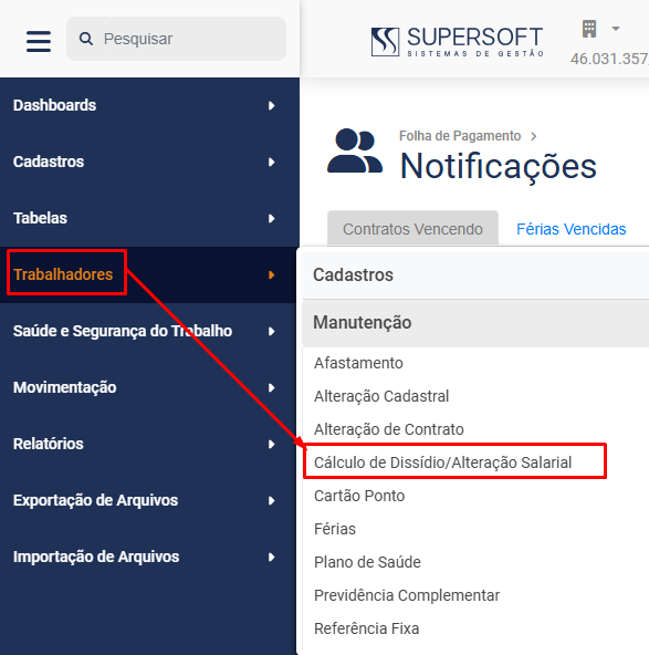 Para que você realize o Cálculo de Dissídio ou Alteração Salarial, deverá acessar o menu Folha de Pagamento>Trabalhadores>Manutenção>Cálculo de Dissídio/Alteração Salarial