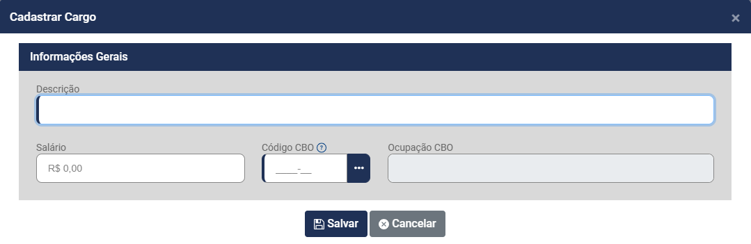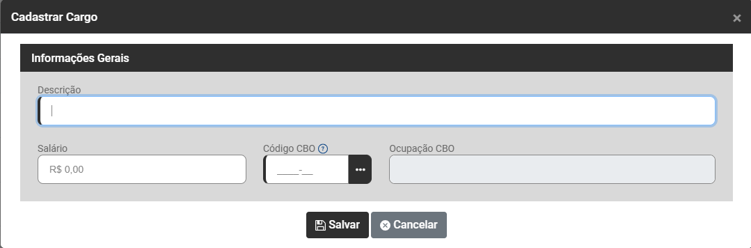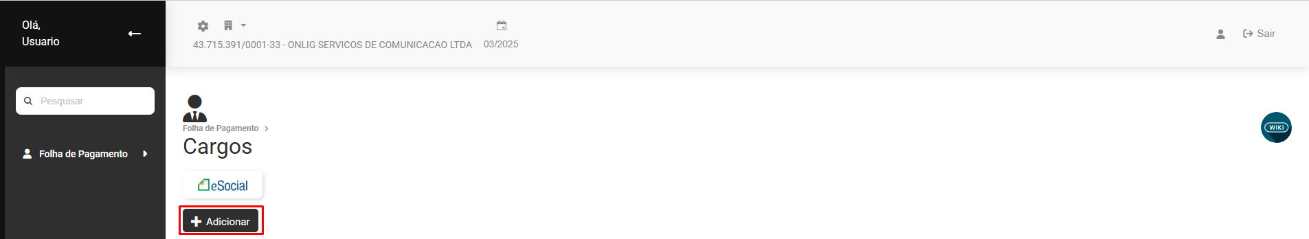 Será apresentada a tela de cadastro de Cargo, clique em Adicionar