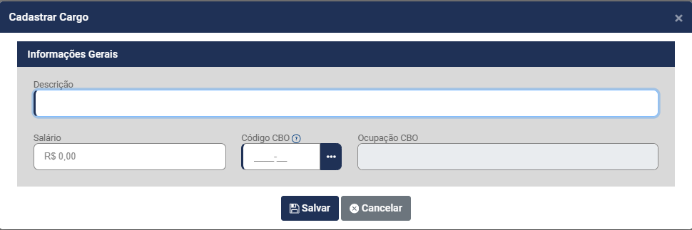 - Salário (campo não obrigatório, se for preenchido, no momento que o cargo for definido para um trabalhador, o campo salário será preenchido automaticamente, podendo ser alterado)