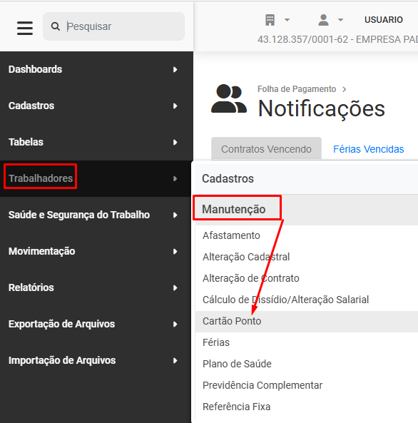 Para Cadastrar o Cartão Ponto dos Trabalhadores da Empresa você deverá acessar o menu Trabalhadores>Manutenção>Cartão Ponto