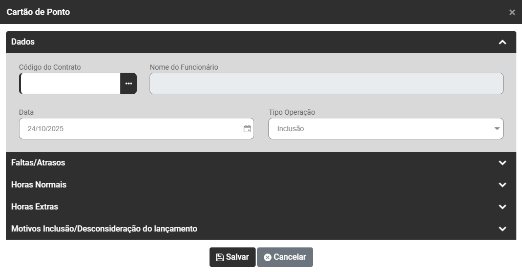 - Horas Normais - Entrada da Manhã, Saída da Manhã, Entrada Tarde, saída Tarde (campo obrigatório)