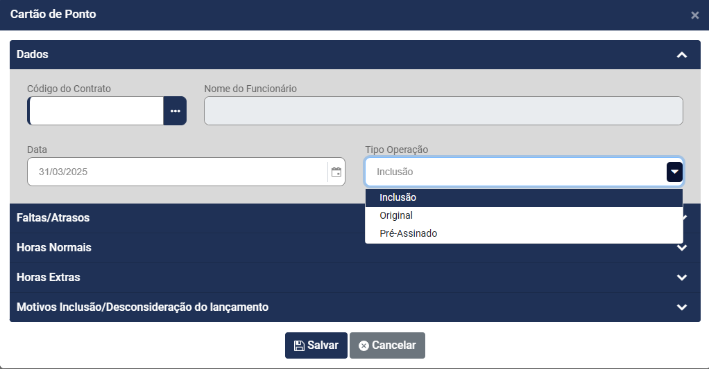 - Nome do funcionário - Será preenchido automaticamente no momento que você informar o Código do Contrato