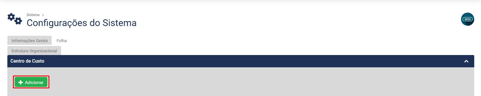 Clique no Botão Adicionar para definir a utilização de de Centro de Custo e para determinação da da Estrutura do mesmo