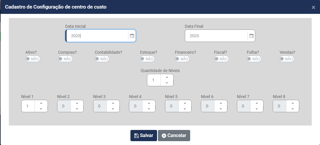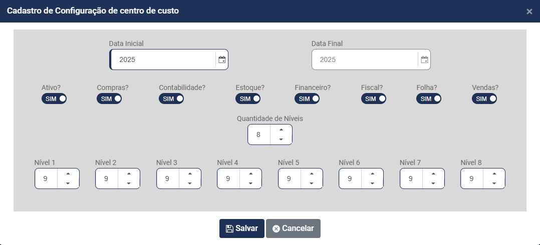d) Informe quantos Níveis terá a Estrutura do do Centro de Custo - Você conseguirá definir até 8 níveis para composição do Centro de Custo