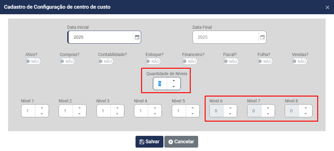 Quando você não define a quantidade total de níveis disponível, o próprio Sistema impede a indicação de quantidade de níveis e caracteres dos níveis que não serão utilizado