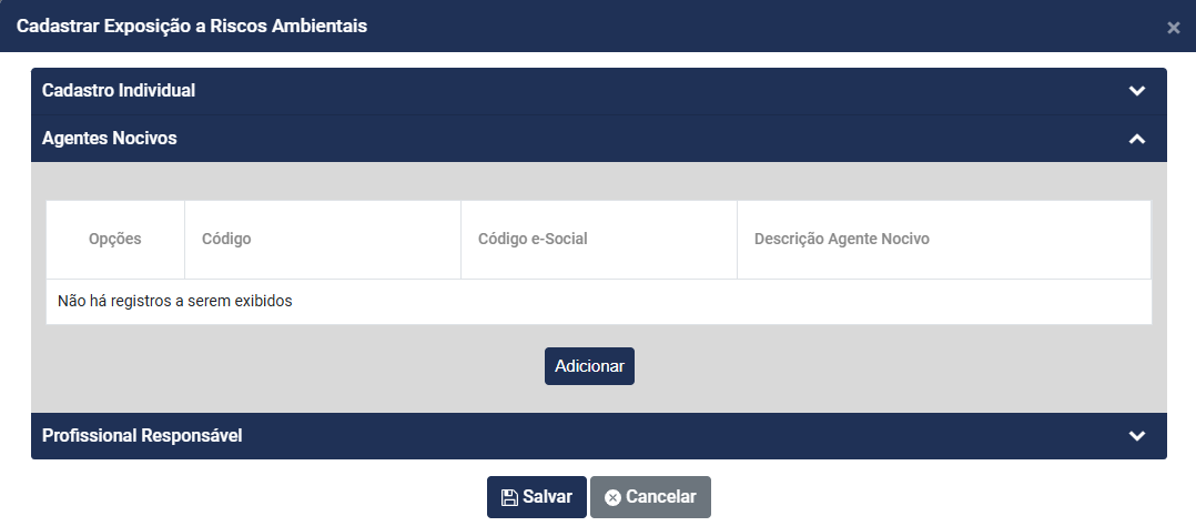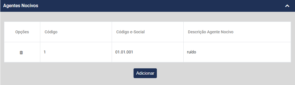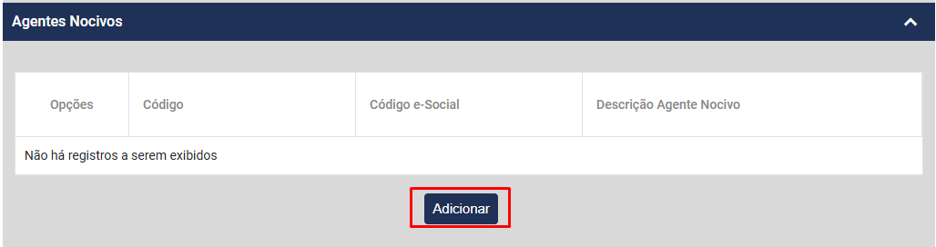 Clique no Botão Adicionar para informar os Agentes Nocivos existentes na Empresa e que os trabalhadores são expostos