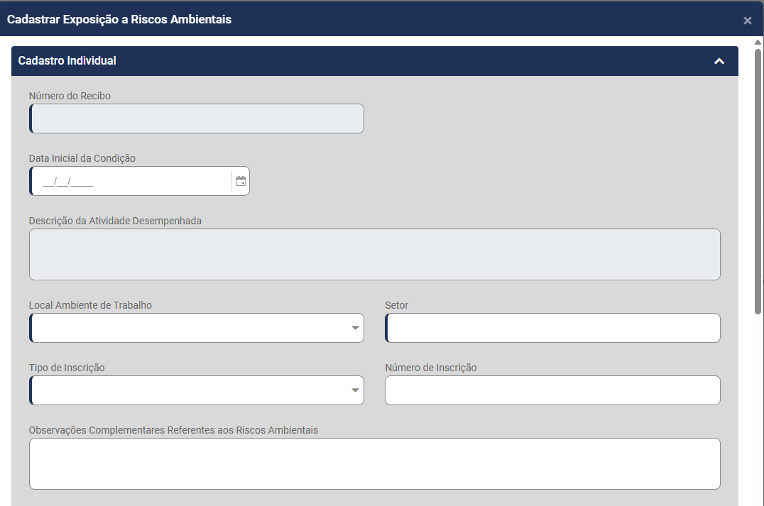 Clique no botão Individual para cadastrar as Condições Ambientais do Trabalho para determinado trabalhador, ao selecionar essa opção, o Módulo trará a tela contendo: