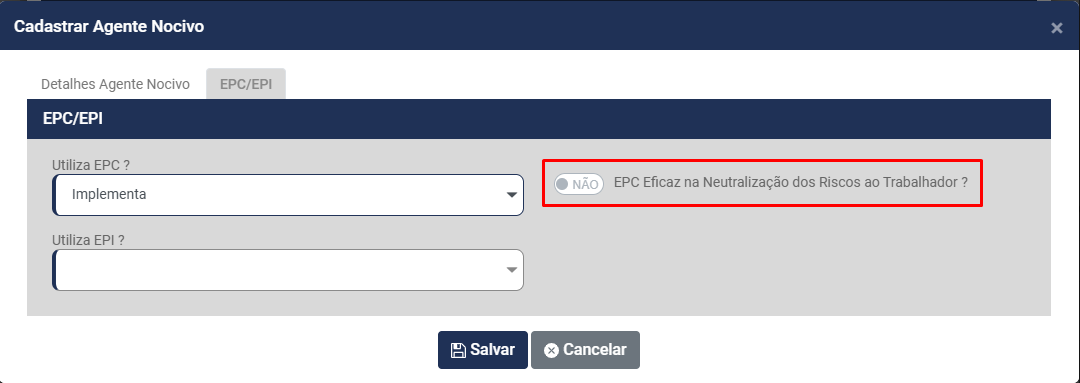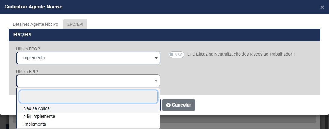 Quando você define Implementa o Módulo apresentará a seleção para que você defina se o EPC é Eficaz na Neutralização dos Riscos do Trabalhador - sim/não