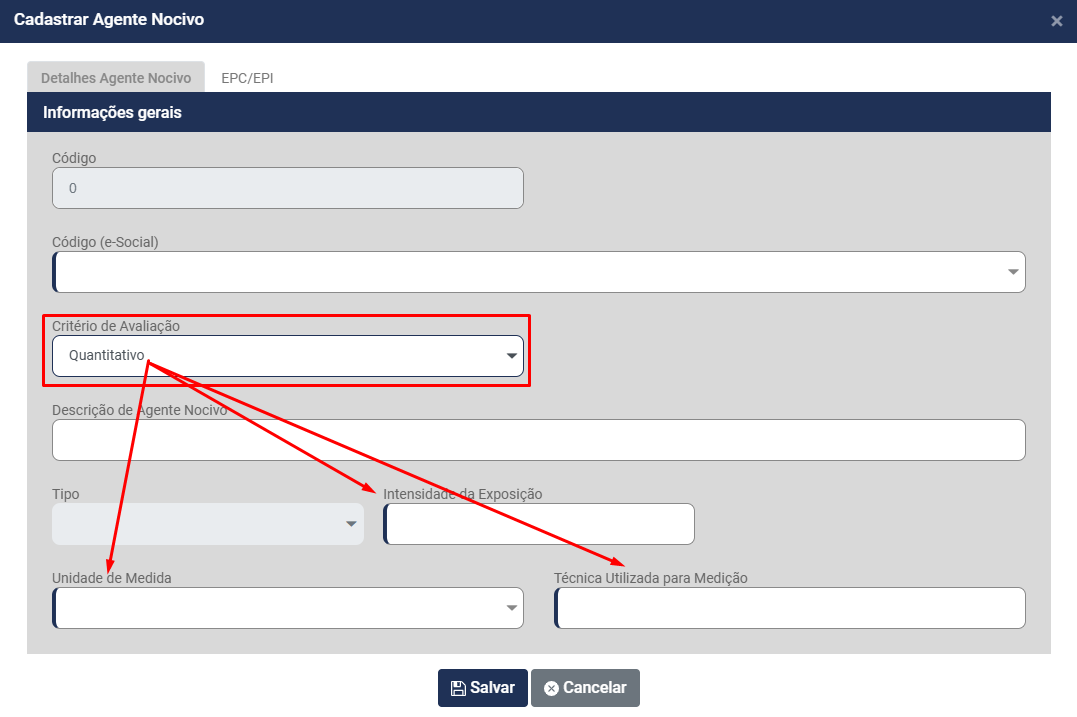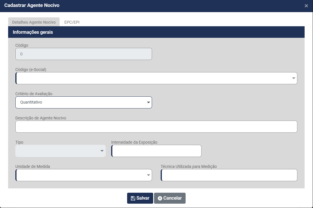 Em seguida será apresentada a tela para cadastrar agente nocivo, com duas abas Detalhes do Agente Nocivo e EPC/EPI