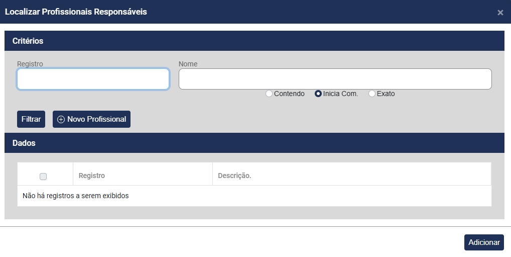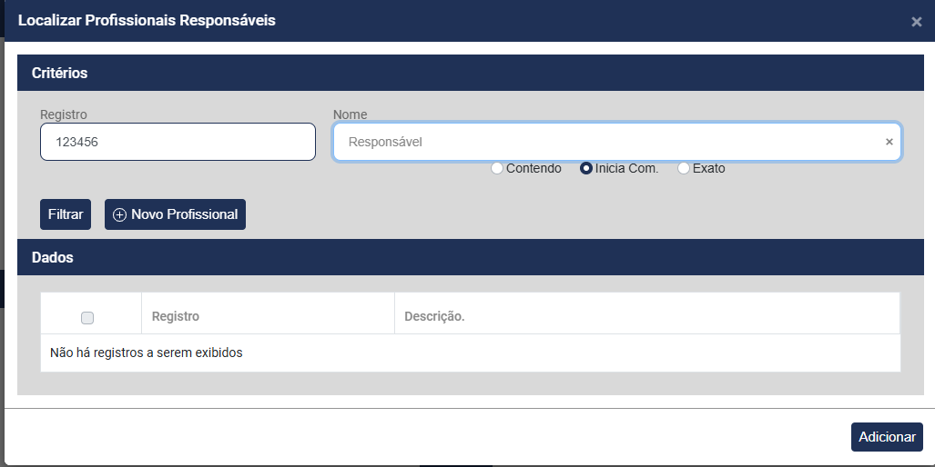 Ao clicar em Filtrar o Módulo preencherá o campo Dados com o Profissional Responsável cadastrado em Critérios, em seguida clique em Adicionar para que o Profissional Responsável seja adicionado ao cadastro que foi realizado