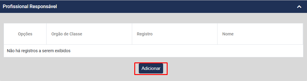 Clique no Botão Adicionar para definição do Profissional Responsável